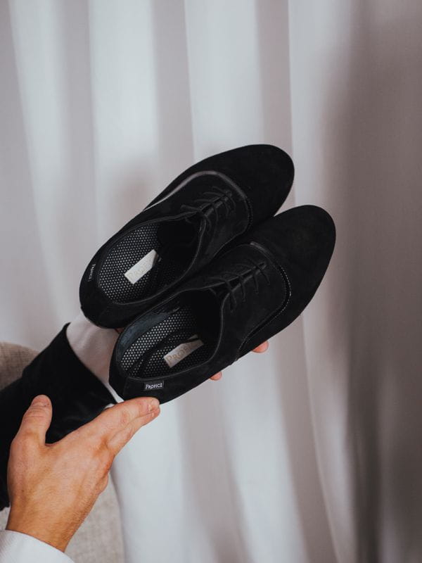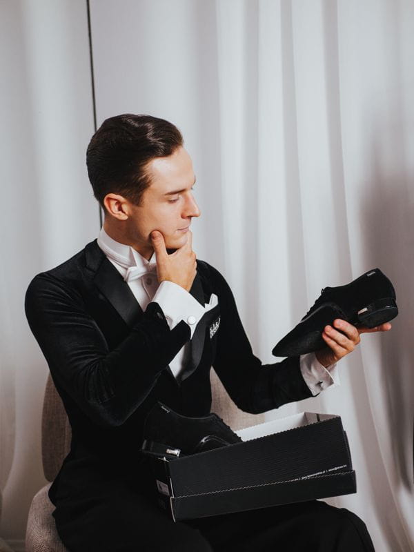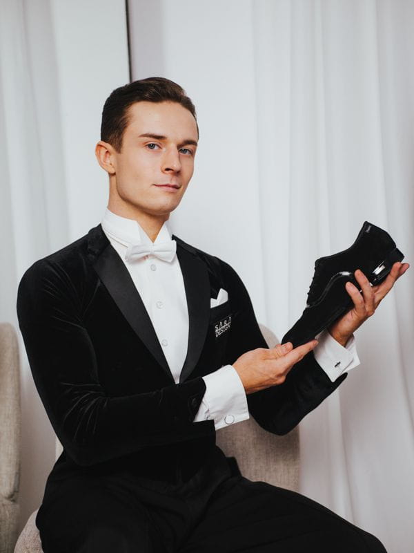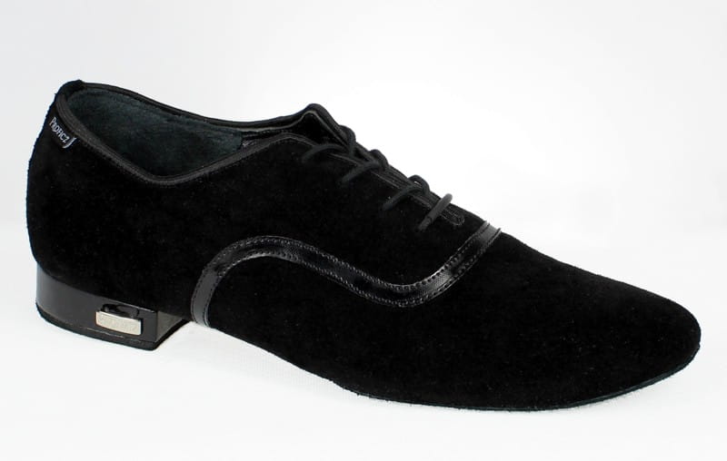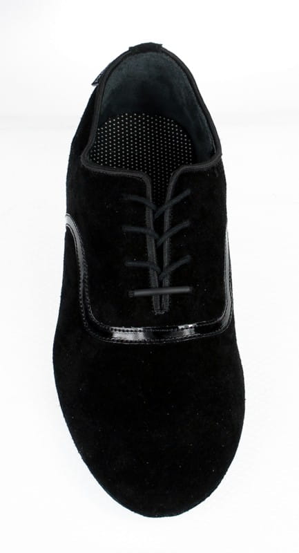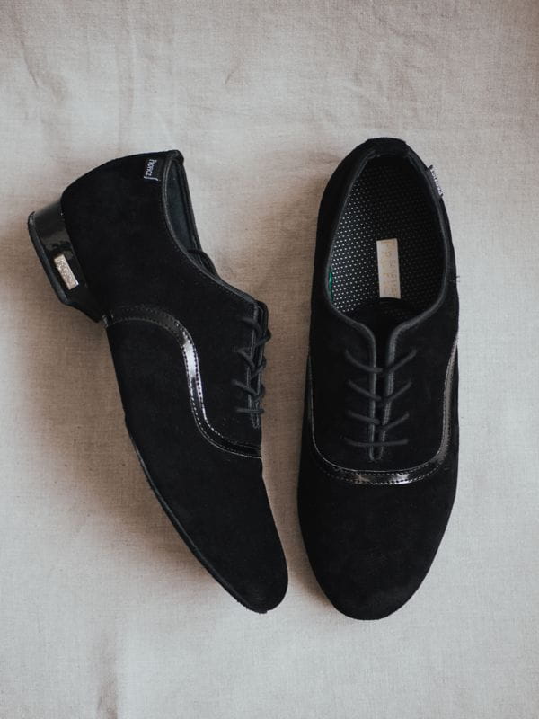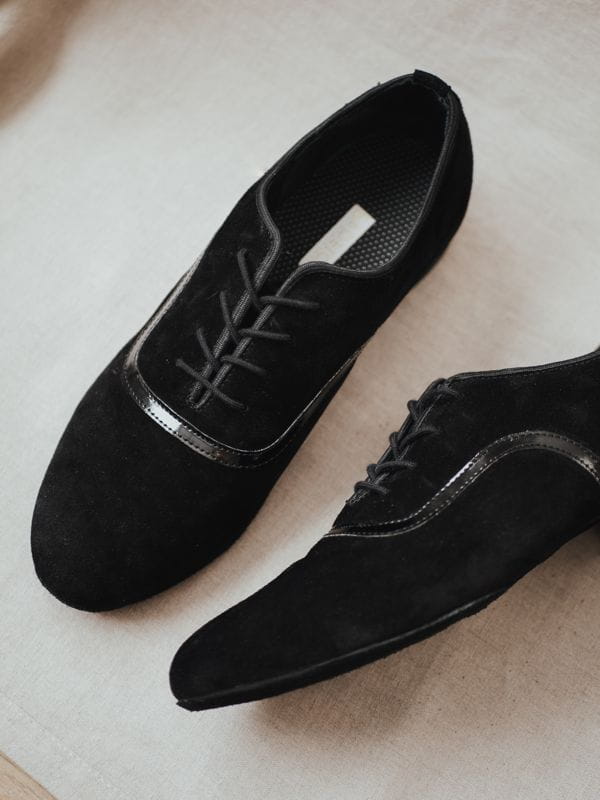 Professional men’s ballroom shoes designed specifically for standard dances. Crafted from soft, high-quality black suede leather with a sleek black patent insert, this model combines elegance with a modern touch. Perfect for both practice and competition performances.