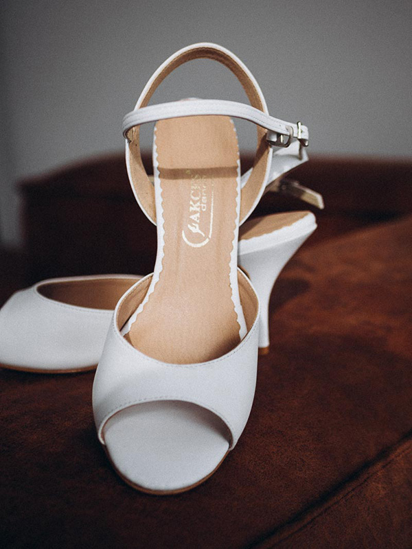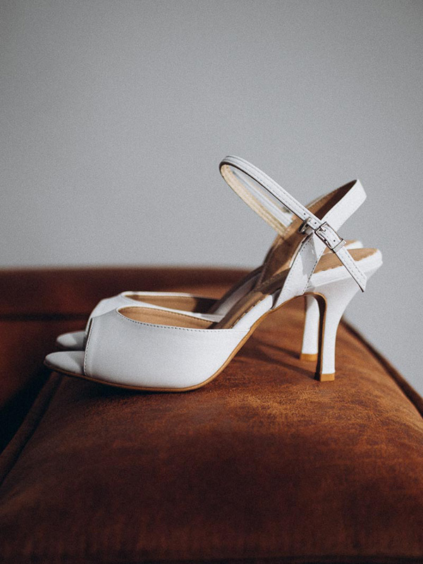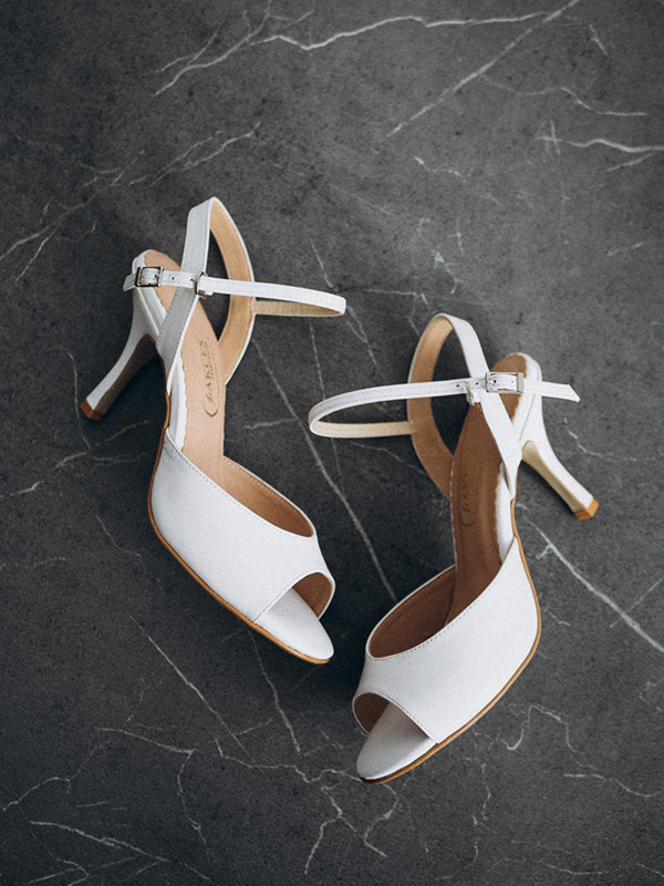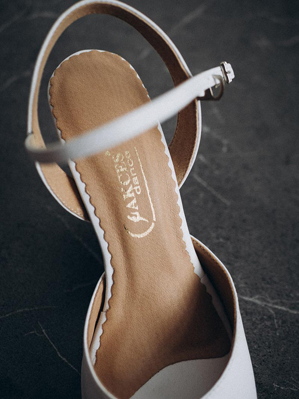 Elegant bridal dance shoes in a timeless white shade combine comfort, style, and functionality. The delicate sandal design with an open heel beautifully highlights the foot while ensuring perfect fit and stability during dancing.