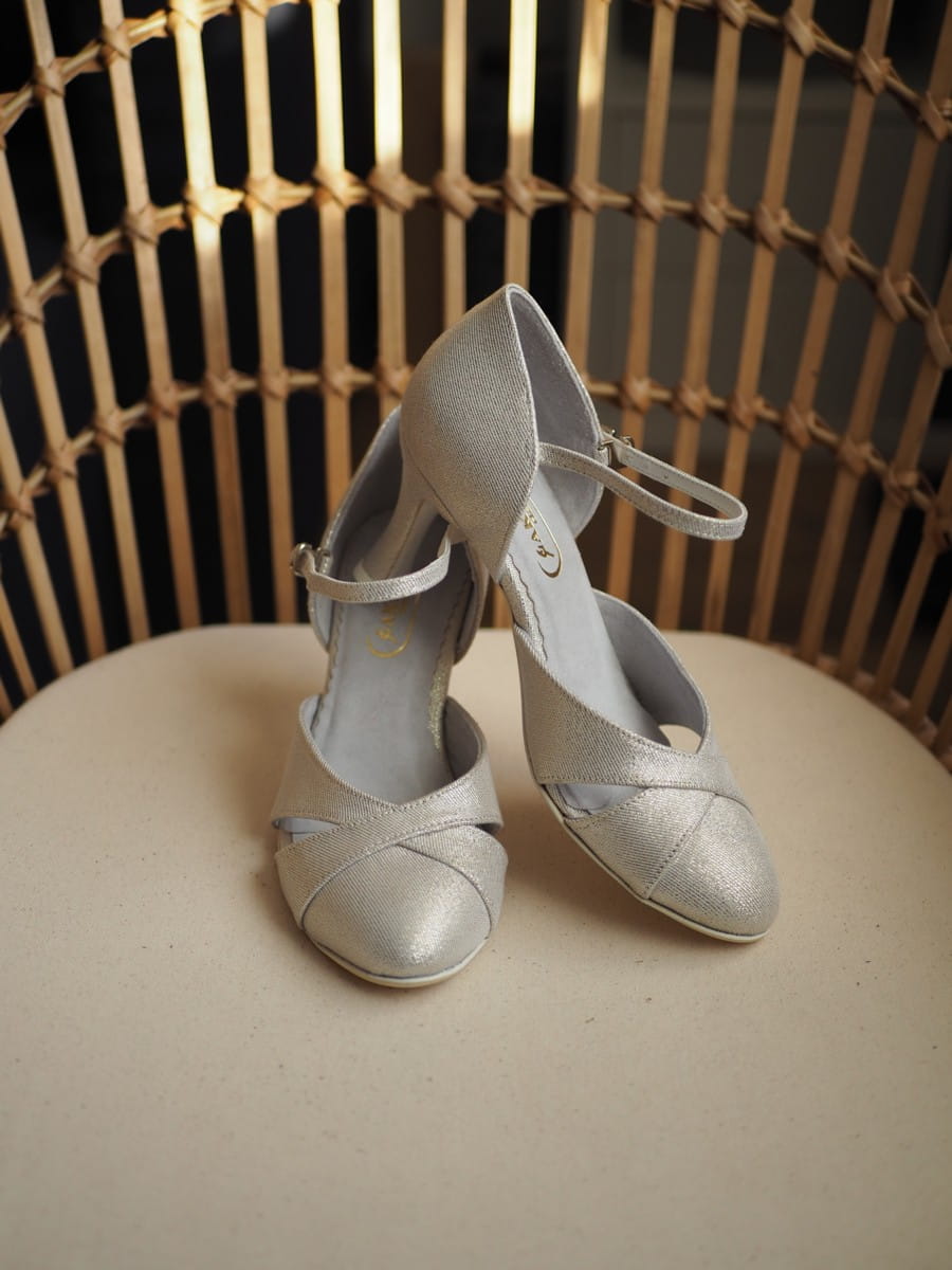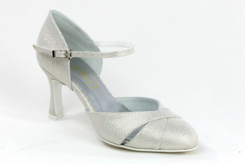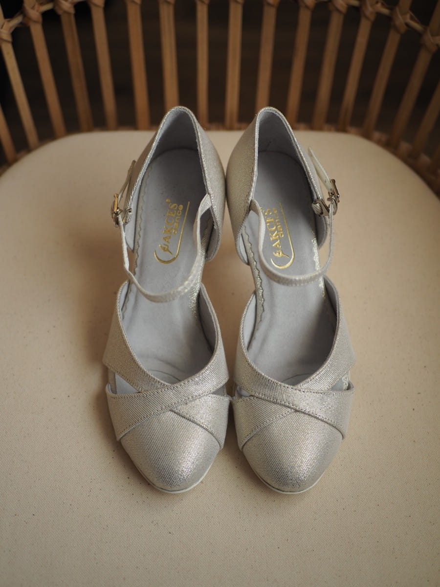 These stylish and comfortable bridal dance shoes are made from eye-catching silver glitter fabric that sparkles beautifully on the foot, adding a touch of elegance to any wedding or formal outfit. Perfect for weddings, receptions, balls, and other special occasions.