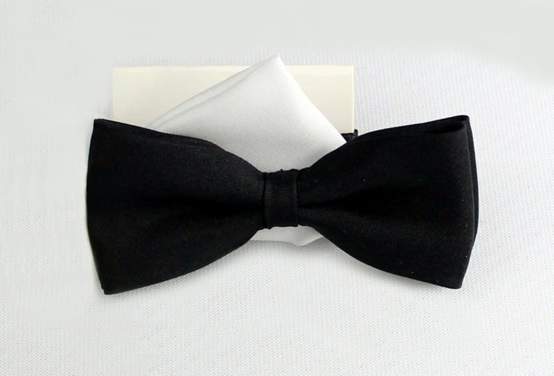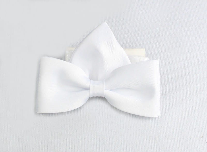 Satynowa mucha taneczna z regulacją obwodu, zapinana na haczyk.