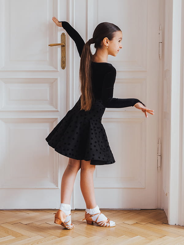 The low block heel supports proper posture and helps maintain balance – essential for young dancers. The suede sole provides excellent grip and smooth movement on the dance floor.